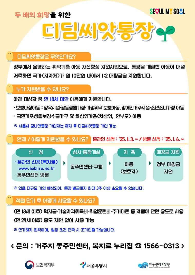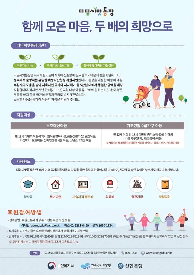 ‘디딤씨앗통장(아동발달지원계좌)’은 정부가 매달 저축액만큼 같은 금액을 더해주는 특별한 제도입니다.