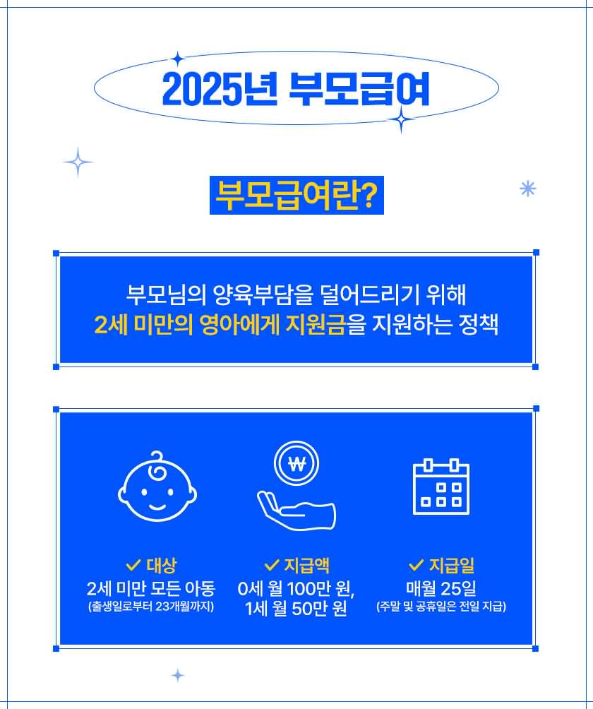 부모급여는 출산과 양육으로 인한 가계 부담을 덜어주기 위해 정부가 2023년부터 도입한 지원 제도입니다. 특히 만 0세와 만 1세 아동을 양육하는 가정에 현금 형태로 지원금이 지급되는데, 2025년 기준으로 지원 금액이 더 확대되면서 관심이 크게 높아졌습니다. 지원금은 아동의 복지와 발달을 위해 자유롭게 사용할 수 있어, 기저귀나 분유, 아동복 구매는 물론 각종 교육비나 의료비에도 활용 가능합니다. 부모급여는 모든 가정이 동일하게 받을 수 있는 제도가 아니라, 아동의 나이와 거주 요건, 보호자의 신청 여부 등에 따라 달라집니다. 특히 육아휴직 급여와 별도로 지급되기 때문에, 부모급여만 잘 챙겨도 매달 가계에 큰 도움이 됩니다.