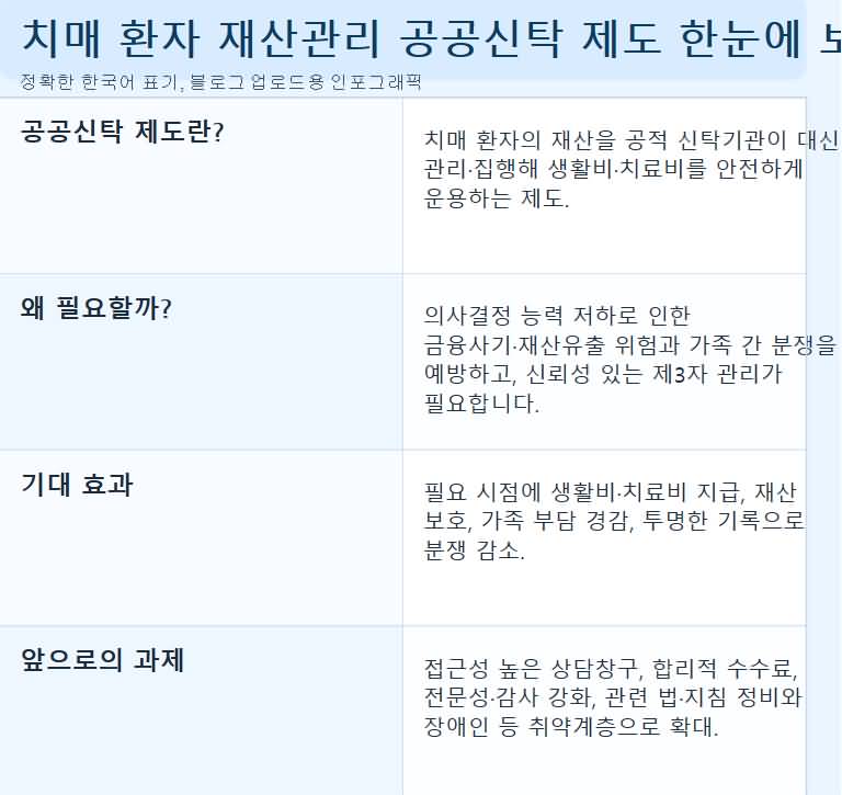 치매는 환자 본인뿐 아니라 가족 모두의 삶을 뒤흔드는 큰 도전입니다. 특히 재산 관리 문제는 갈등과 불안을 키우는 주요 요인으로 꼽히죠. “혹시라도 재산이 잘못 관리되면 어쩌지?” 하는 걱정은 누구나 할 수밖에 없습니다. 이런 상황에서 정부가 새롭게 추진하는 공공신탁 제도는 많은 이들의 눈길을 끌고 있습니다. 단순한 복지가 아니라, 치매 환자의 재산을 지켜주고 가족의 부담을 줄이는 사회적 안전망 역할을 하기 때문입니다. 오늘은 이 공공신탁 제도가 무엇이고, 왜 필요한지, 그리고 앞으로 어떤 변화를 가져올지 함께 살펴보겠습니다.
